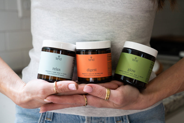 The Tend Whole Body Bundle brings together our three hero formulas—Digest, Relax, and Glow—so you can support your gut, your calm, and your skin in one simple routine.